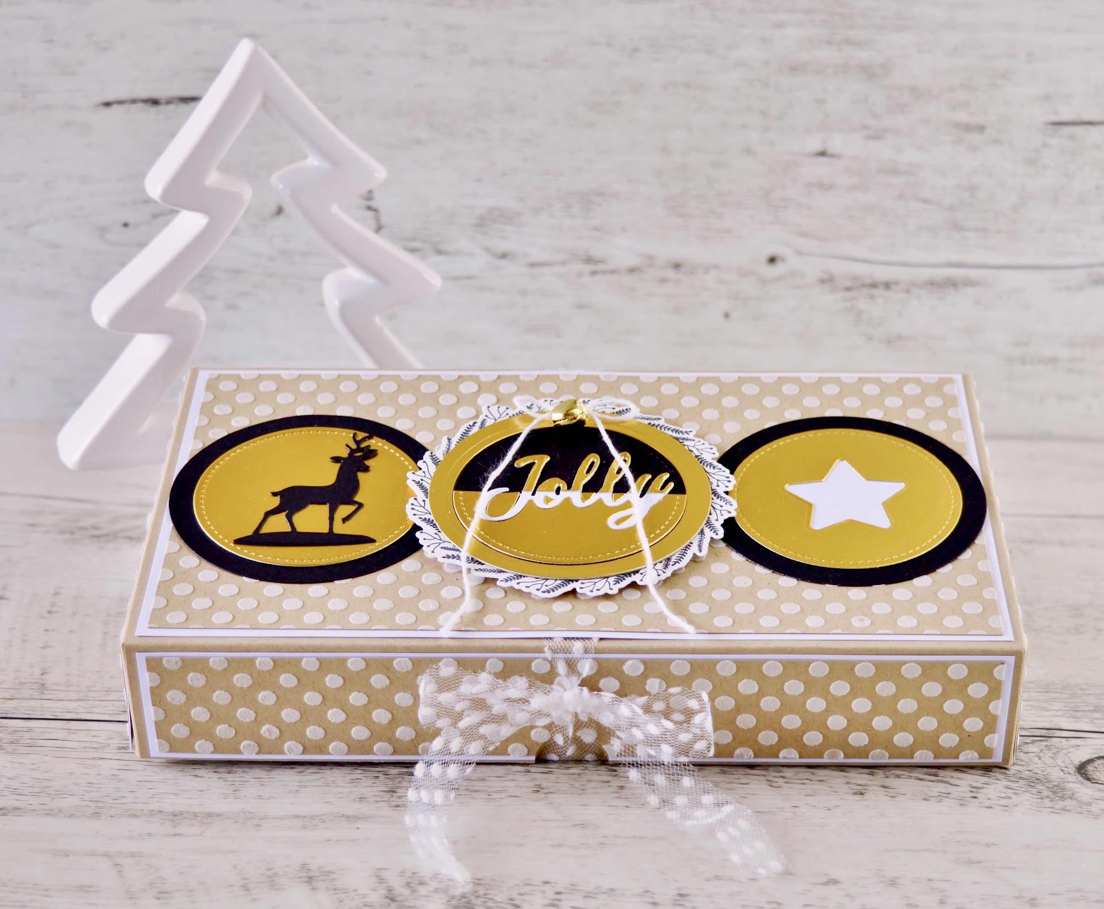 Three die cut circles have been adhered to the top of the box. These have been created from Gold Foil Sheets (item 132622) and Basic Black card (item 121688) using Stitched Shapes Dies (item 145372) and Layering Circles Dies (item 141705). Next, I picked a couple of my favourite dies to inlay, die cut or adhere to the circles, choosing the deer from the Snow Globes Scenes Dies (item 150655), the "jolly" word die from Jolly Season Dies (item 150648) and the star from the Mini Curvy Keepsake Box Dies (item 150644).